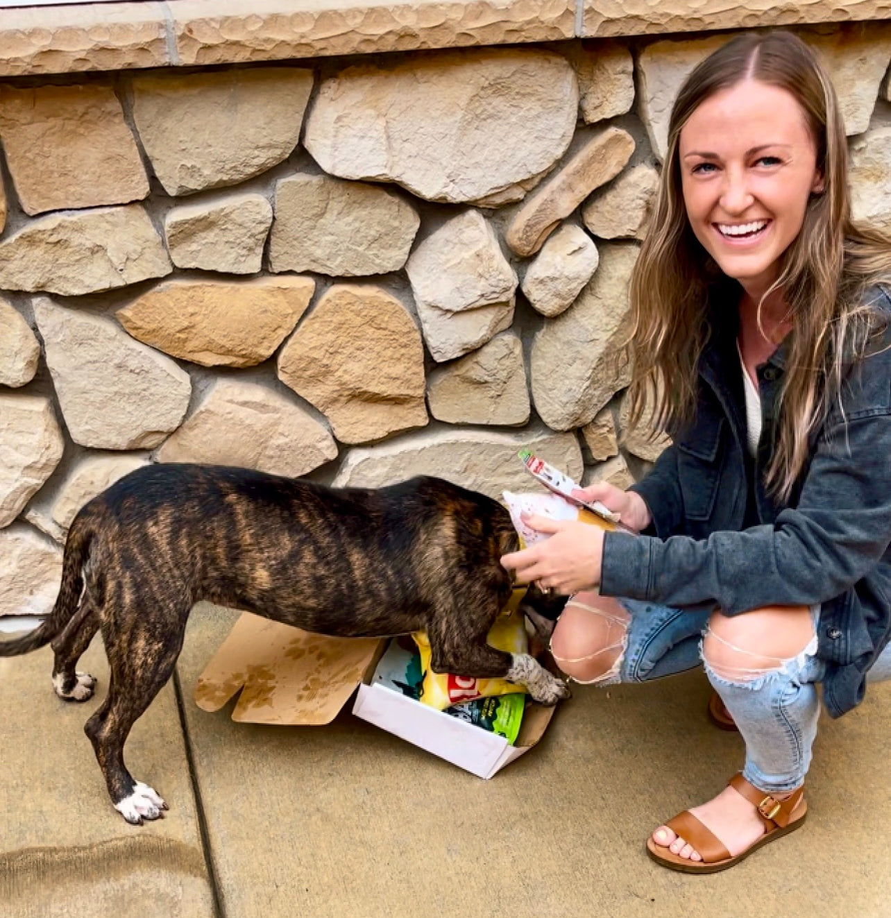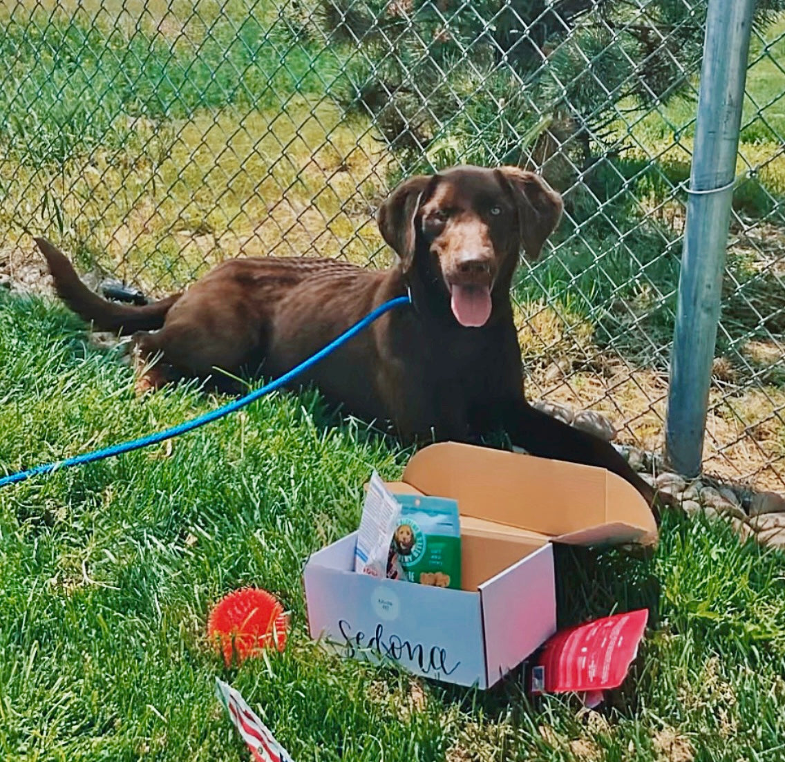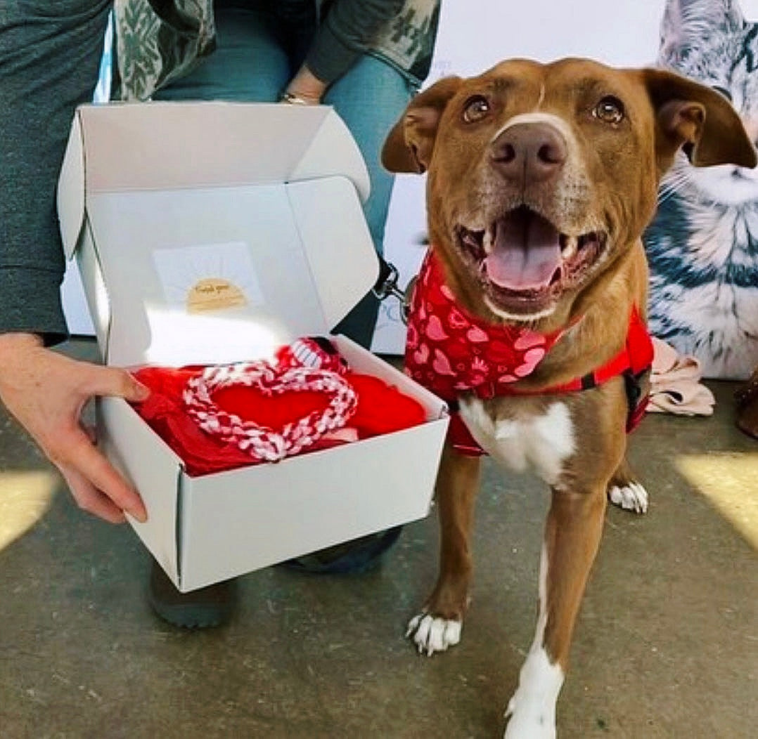 The donated box will include two treats, two toys, and one unique item, such as a bandana, paw balm, or flavored bubbles. (It’s been discovered that dogs wearing bandanas are adopted sooner than those not!)
